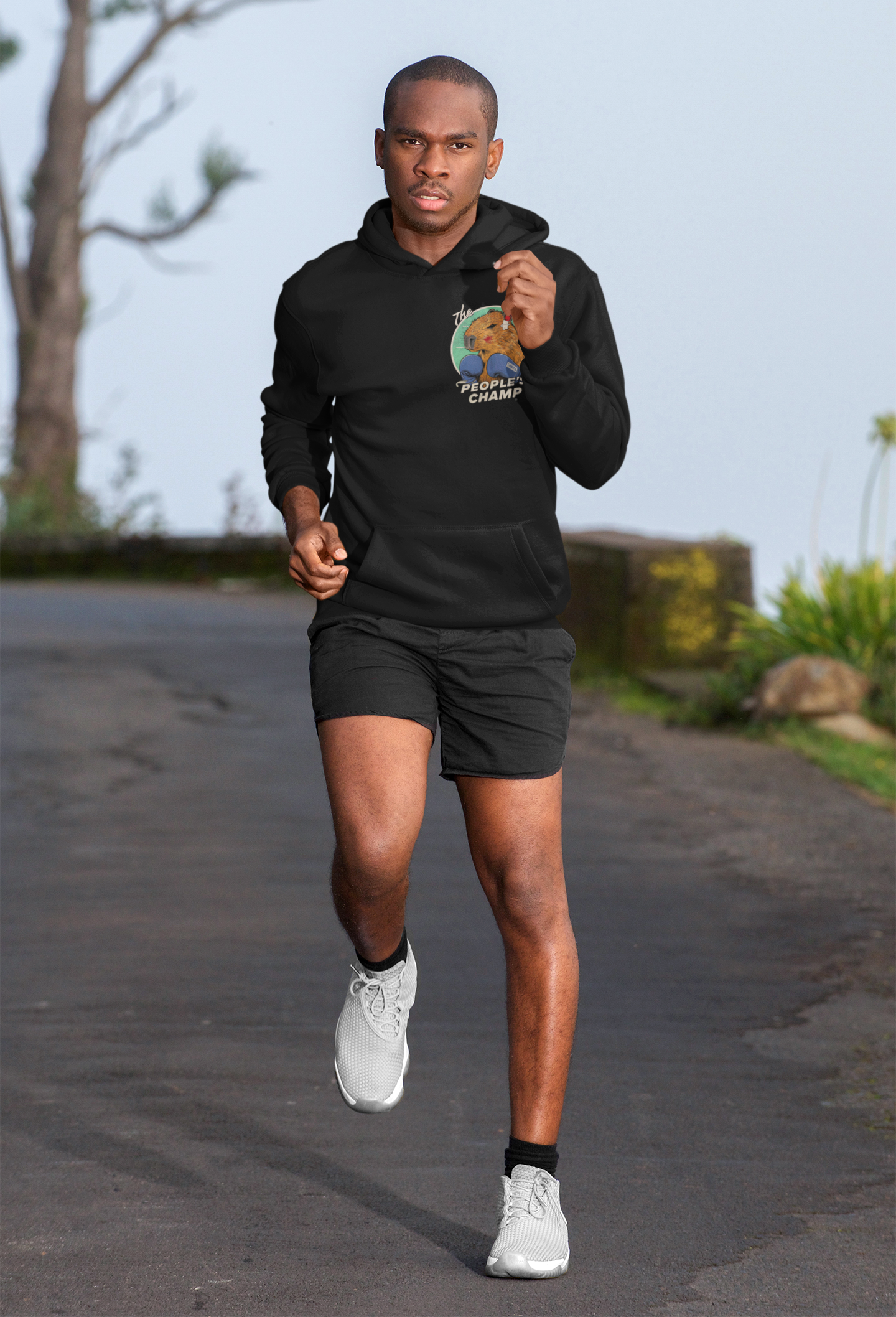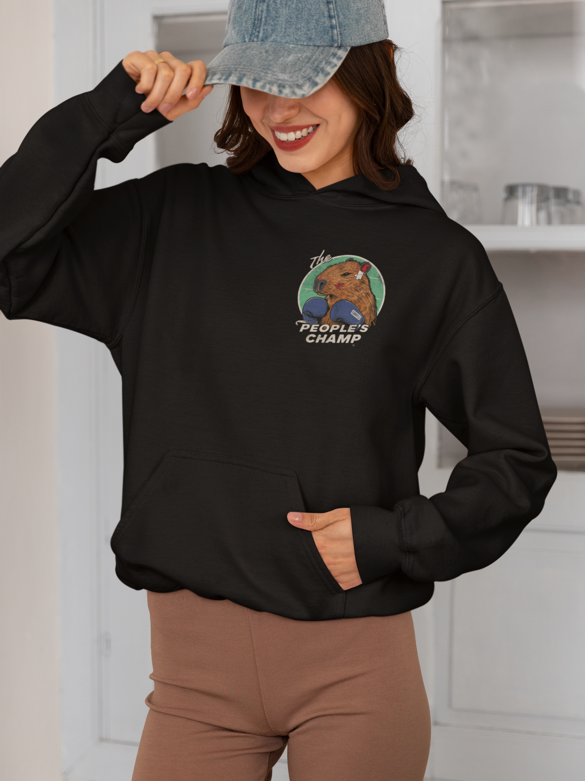Prepare-se para o ringue com o nosso moletom unissex preto The People's Champ! Este design ousado apresenta uma capivara boxeadora, pronta para a luta, com a frase "The People's Champ" estampada. Confeccionado com tecido macio e quente, é a escolha perfeita para quem quer se destacar com estilo e atitude enquanto mantém o conforto. Ideal para fãs de boxe, capivaras e todos que amam uma vibe poderosa e divertida. Mostre quem é o verdadeiro campeão! Características: -Tecido confortável e durável -Capuz ajustável e bolso estilo canguru -Design exclusivo com capivara boxeadora e frase "The People's Champ" -Disponível em vários tamanhos -Seja o campeão com estilo e conforto, e inspire todos ao seu redor!